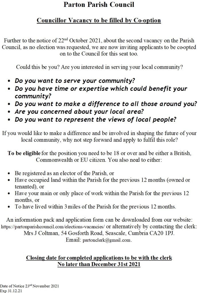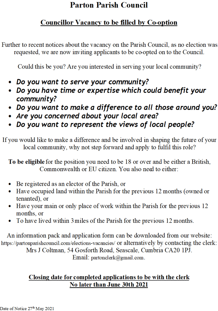 Further details and an application form can be downloaded below or alternatively requested by contacting the clerk: Mrs J Coltman, 54 Gosforth Road, Seascale, Cumbria CA20 1PJ.